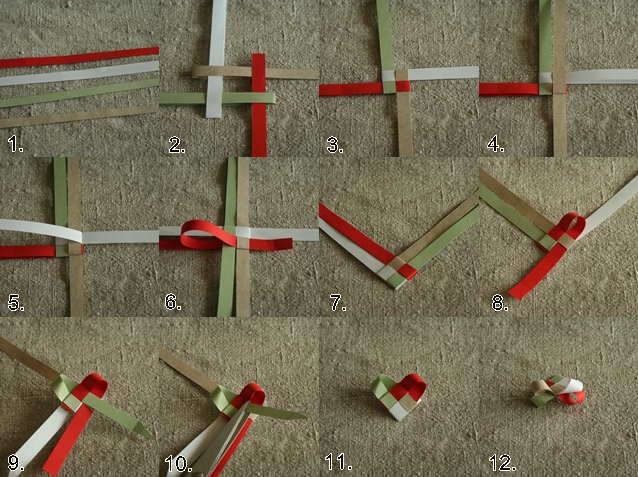 2-3. Vik alla remsor på mitten. Fläta ihop remsorna och dra ihop så att de bildar ett rut mönster.